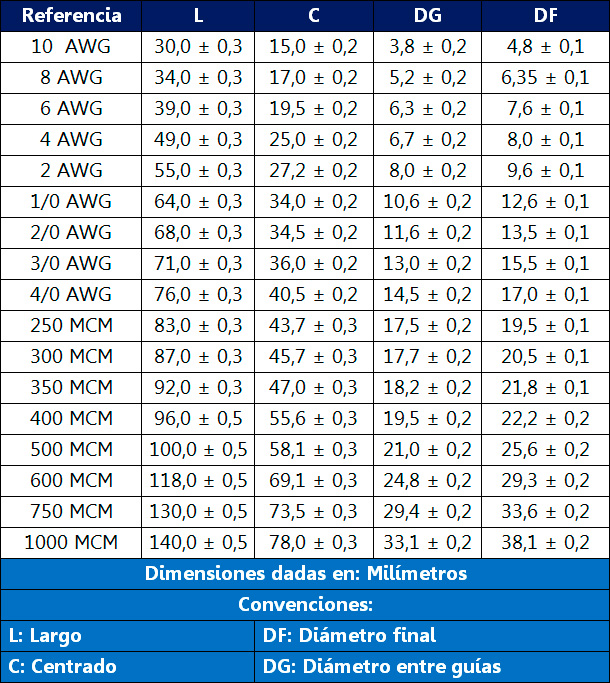 Usos permitidos: Circuitos eléctricos de baja tensión con un rango de operación de hasta 1000 Voltios y con rango de uso entre 10 AWG y 1.000 KCMIL.