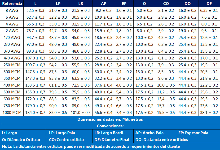 Usos permitidos: Circuitos eléctricos de baja tensión con un rango de operación de hasta 1000 Voltios y con rango de uso entre 10 AWG y 1.000 KCMIL.